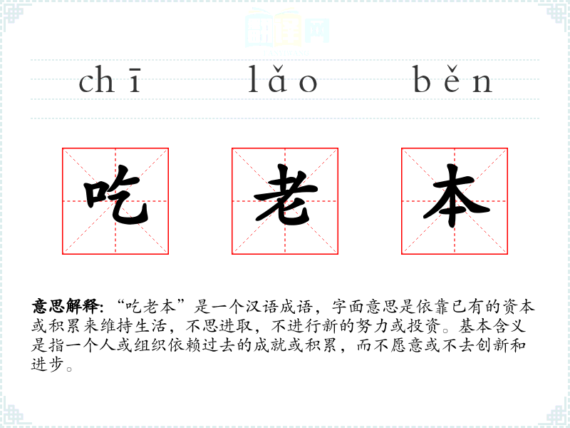 “吃老本”是一个汉语成语,字面意思是依靠已有的资本或积累来维持生活,不思进取,不进行新的努力或投资。基本含义是指一个人或组织依赖过去的成就或积累,而不愿意或不去创新和进步。