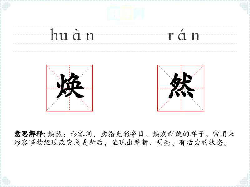 焕然:形容词,意指光彩夺目、焕发新貌的样子。常用来形容事物经过改变或更新后,呈现出崭新、明亮、有活力的状态。