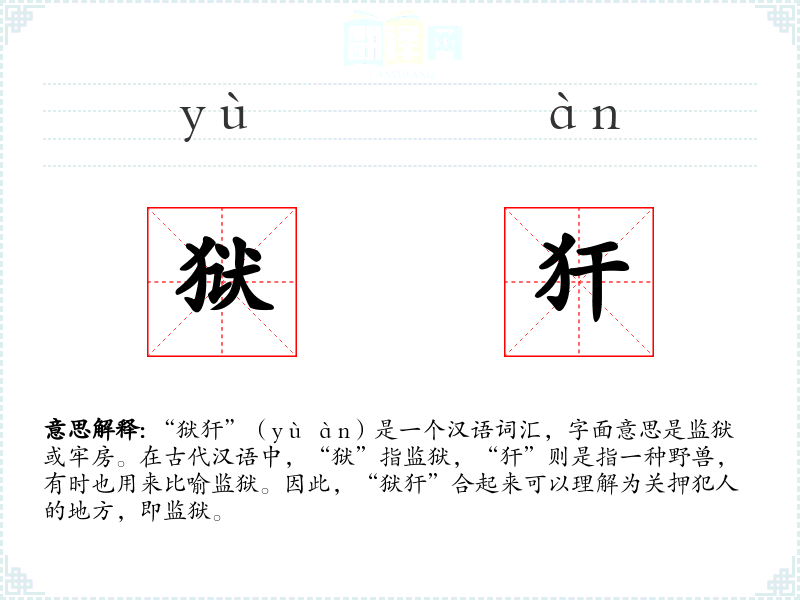 “狱犴”(yù àn)是一个汉语词汇,字面意思是监狱或牢房。在古代汉语中,“狱”指监狱,“犴”则是指一种野兽,有时也用来比喻监狱。因此,“狱犴”合起来可以理解为关押犯人的地方,即监狱。