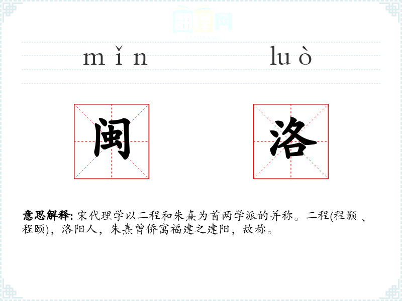 宋代理学以二程和朱熹为首两学派的并称。二程(程颢﹑程颐),洛阳人,朱熹曾侨寓福建之建阳,故称。