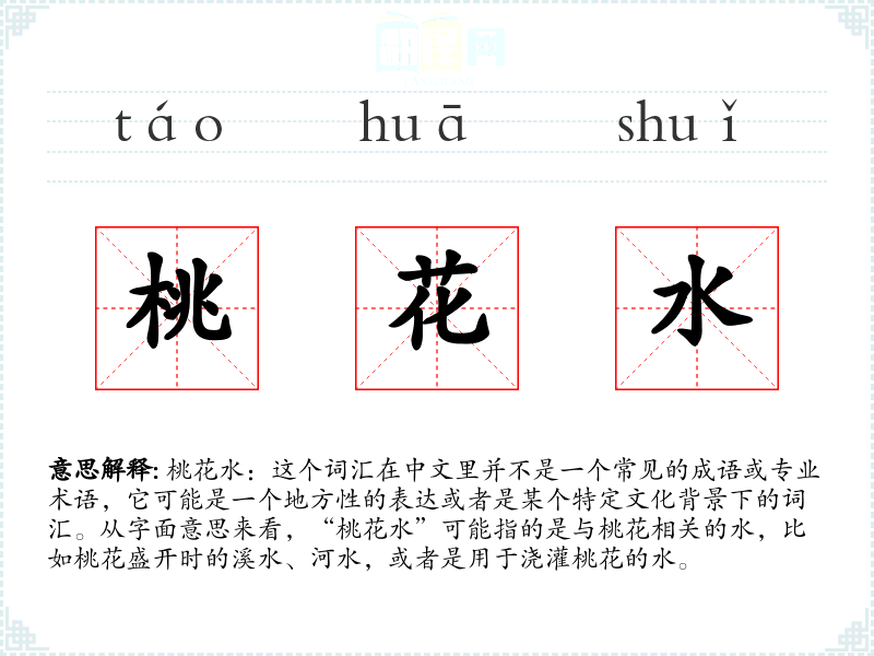 由于“桃花水”不是一个广泛使用的词汇,它在其他语言或文化中可能没有直接对应的表达。