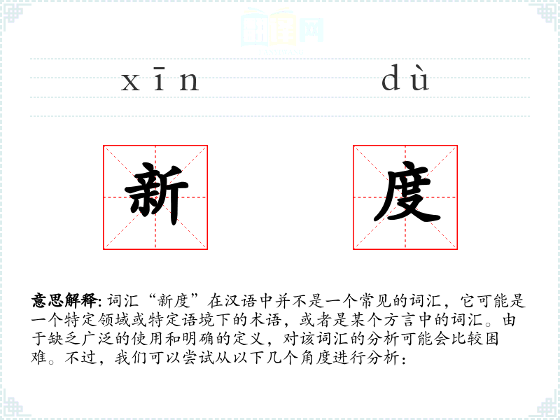 由于“新度”不是一个标准汉语词汇,我们无法给出一个确切的基本定义。它可能是指“新鲜程度”或“新颖程度”的意思,但这只是基于字面组合的猜测。