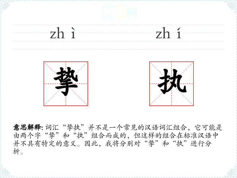 词汇“挚执”并不是一个常见的汉语词汇组合,它可能是由两个字“挚”和“执”组合而成的,但这样的组合在标准汉语中并不具有特定的意义。因此,我将分别对“挚”和“执”进行分析。