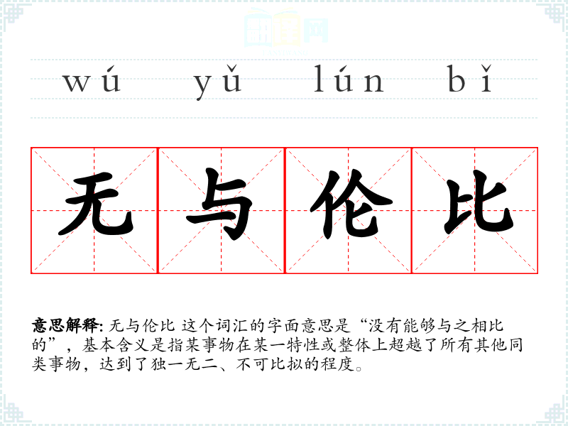 无与伦比 这个词汇的字面意思是“没有能够与之相比的”,基本含义是指某事物在某一特性或整体上超越了所有其他同类事物,达到了独一无二、不可比拟的程度。