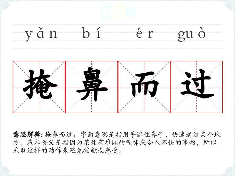掩鼻而过:字面意思是指用手遮住鼻子,快速通过某个地方。基本含义是指因为某处有难闻的气味或令人不快的事物,所以采取这样的动作来避免接触或感受。