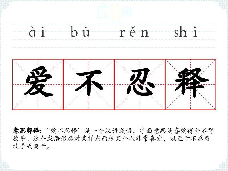 “爱不忍释”是一个汉语成语,字面意思是喜爱得舍不得放手。这个成语形容对某样东西或某个人非常喜爱,以至于不愿意放手或离开。