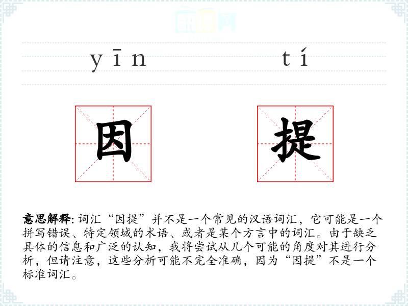 由于“因提”不是一个标准词汇,我们无法给出确切的基本定义。它可能是某个特定语境下的缩写、简称或者是某个特定社群中的术语。