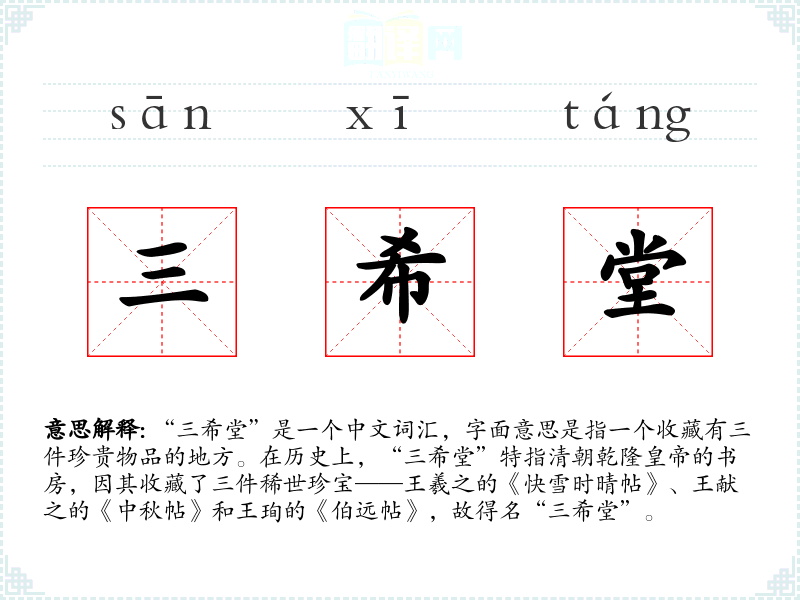 “三希堂”是一个中文词汇,字面意思是指一个收藏有三件珍贵物品的地方。在历史上,“三希堂”特指清朝乾隆**的书房,因其收藏了三件稀世珍宝——王羲之的《快雪时晴帖》、王献之的《中秋帖》和王珣的《伯远帖》,故得名“三希堂”。