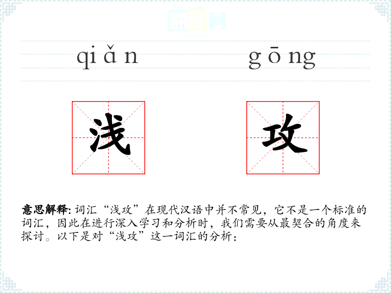 词汇“浅攻”在现代汉语中并不常见,它不是一个标准的词汇,因此在进行深入学习和分析时,我们需要从最契合的角度来探讨。以下是对“浅攻”这一词汇的分析: