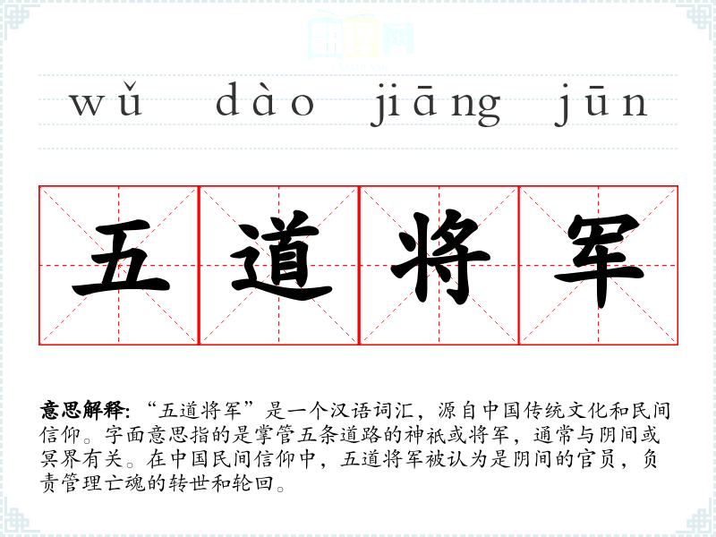 “五道将军”是一个汉语词汇,源自传统文化和民间信仰。字面意思指的是掌管五条道路的神祇或将军,通常与阴间或冥界有关。在民间信仰中,五道将军被认为是阴间的官员,负责管理亡魂的转世和轮回。