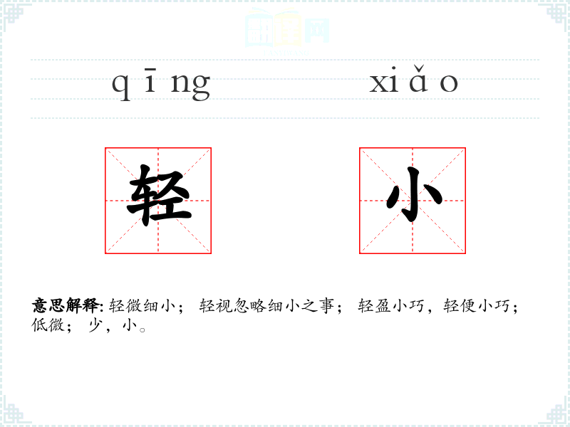 轻微细小; 轻视忽略细小之事; 轻盈小巧,轻便小巧; 低微; 少,小。