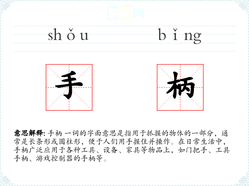 手柄 一词的字面意思是指用于抓握的物体的一部分,通常是长条形或圆柱形,便于人们用手握住并操作。在日常生活中,手柄广泛应用于各种工具、设备、家具等物品上,如门把手、工具手柄、游戏控制器的手柄等。