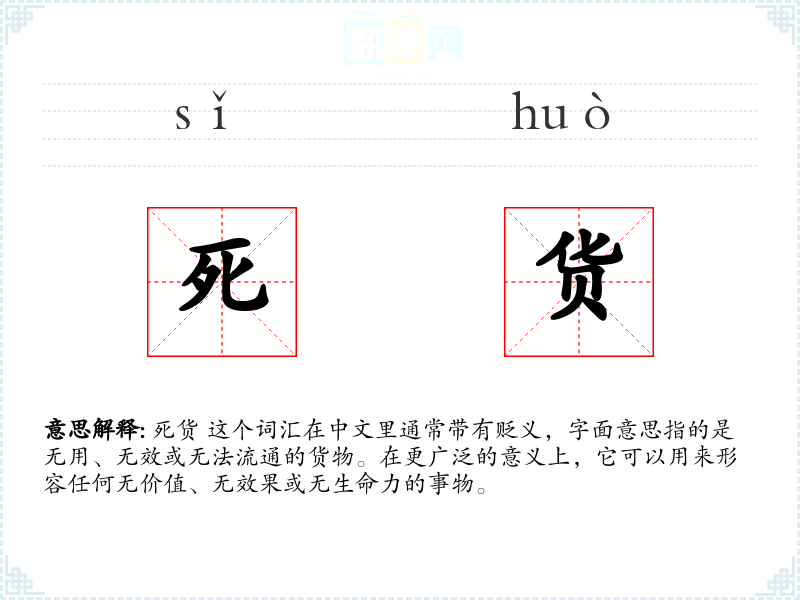 死货 这个词汇在中文里通常带有贬义,字面意思指的是无用、无效或无法流通的货物。在更广泛的意义上,它可以用来形容任何无价值、无效果或无生命力的事物。