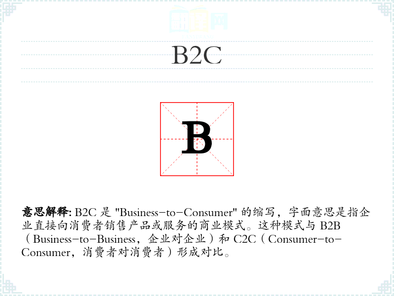 B2C 是 "Business-to-Consumer" 的缩写,字面意思是指企业直接向消费者销售产品或服务的商业模式。这种模式与 B2B(Business-to-Business,企业对企业)和 C2C(Consumer-to-Consumer,消费者对消费者)形成对比。