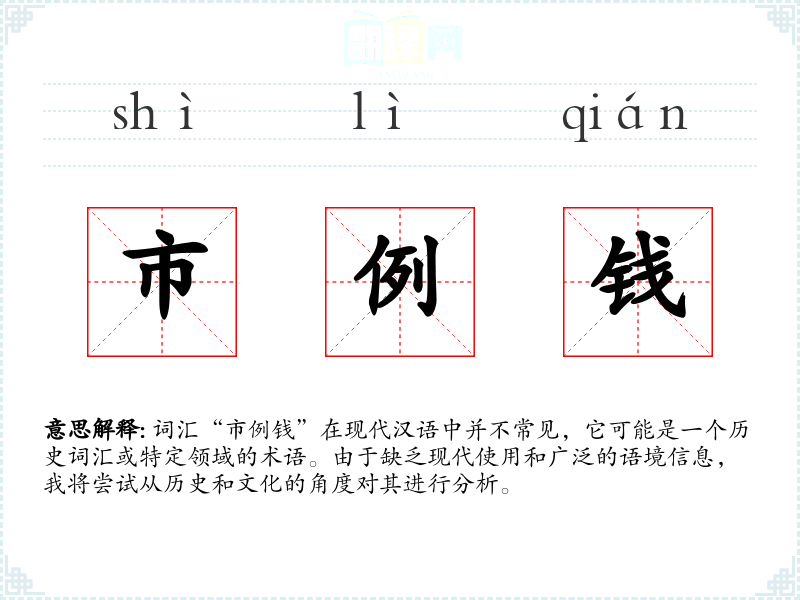 词汇“市例钱”在现代汉语中并不常见,它可能是一个历史词汇或特定领域的术语。由于缺乏现代使用和广泛的语境信息,我将尝试从历史和文化的角度对其进行分析。