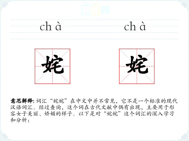 词汇“姹姹”在中文中并不常见,它不是一个标准的现代汉语词汇。经过查询,这个词在古代文献中偶有出现,主要用于形容女子美丽、娇媚的样子。以下是对“姹姹”这个词汇的深入学*和分析: