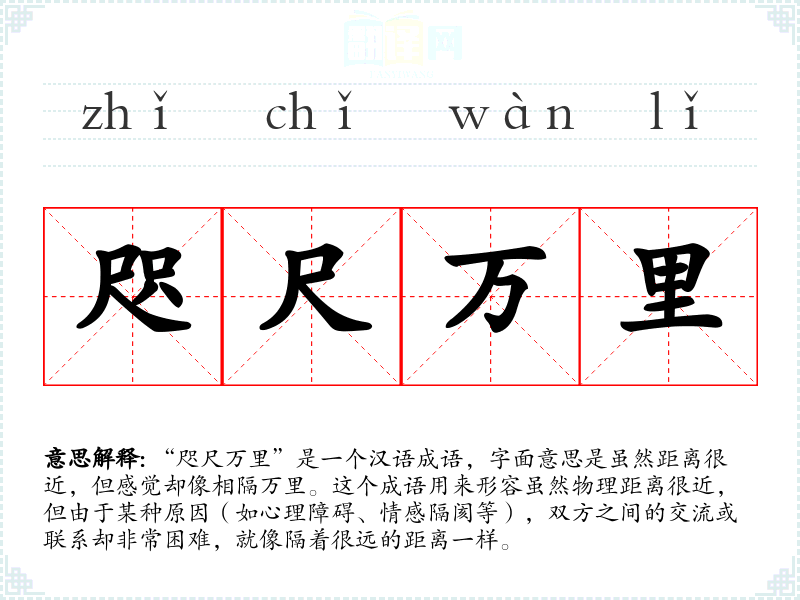 “咫尺万里”是一个汉语成语,字面意思是虽然距离很近,但感觉却像相隔万里。这个成语用来形容虽然物理距离很近,但由于某种原因(如心理障碍、情感隔阂等),双方之间的交流或联系却非常困难,就像隔着很远的距离一样。