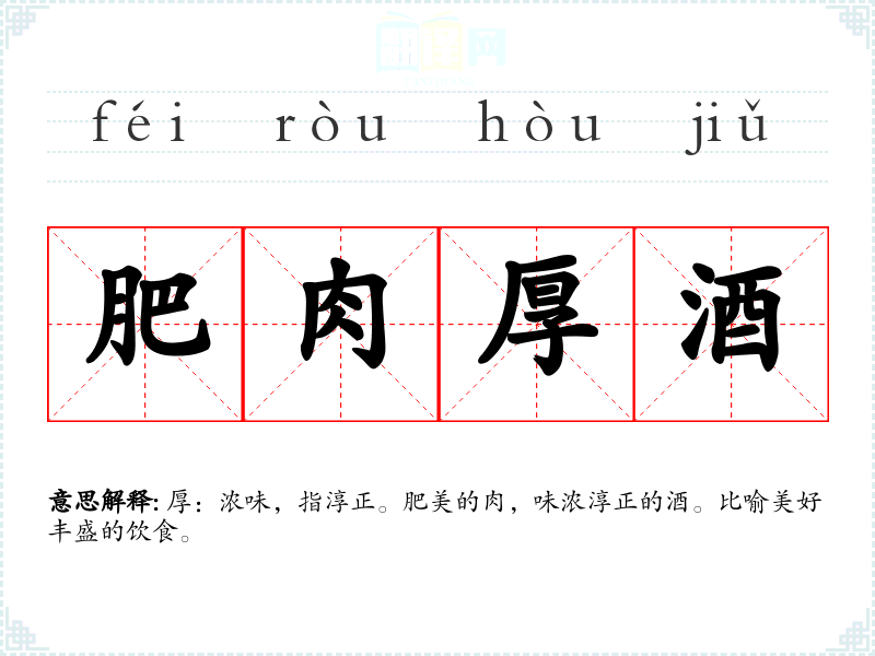 厚:浓味,指淳正。肥美的肉,味浓淳正的酒。比喻美好丰盛的饮食。