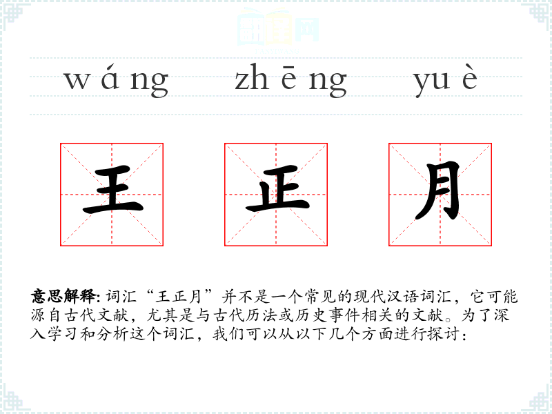 词汇“王正月”并不是一个常见的现代汉语词汇,它可能源自古代文献,尤其是与古代历法或历史*相关的文献。为了深入学和分析这个词汇,我们可以从以下几个方面进行探讨: