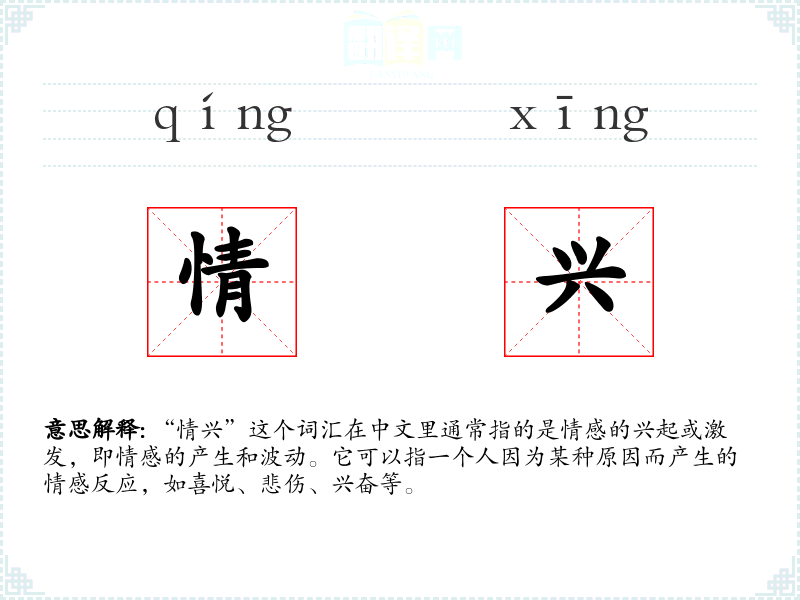 在英语中,“情兴”可以对应为“emotional arousal”或“emotional surge”,虽然在表达上略有不同,但都强调了情感的兴起和强烈变化。