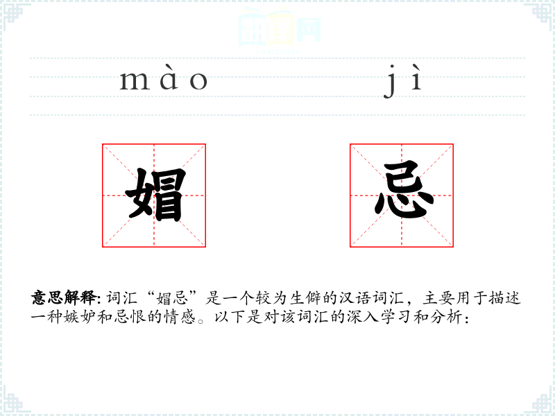 词汇“媢忌”是一个较为生僻的汉语词汇,主要用于描述一种嫉妒和忌恨的情感。以下是对该词汇的深入学*和分析: