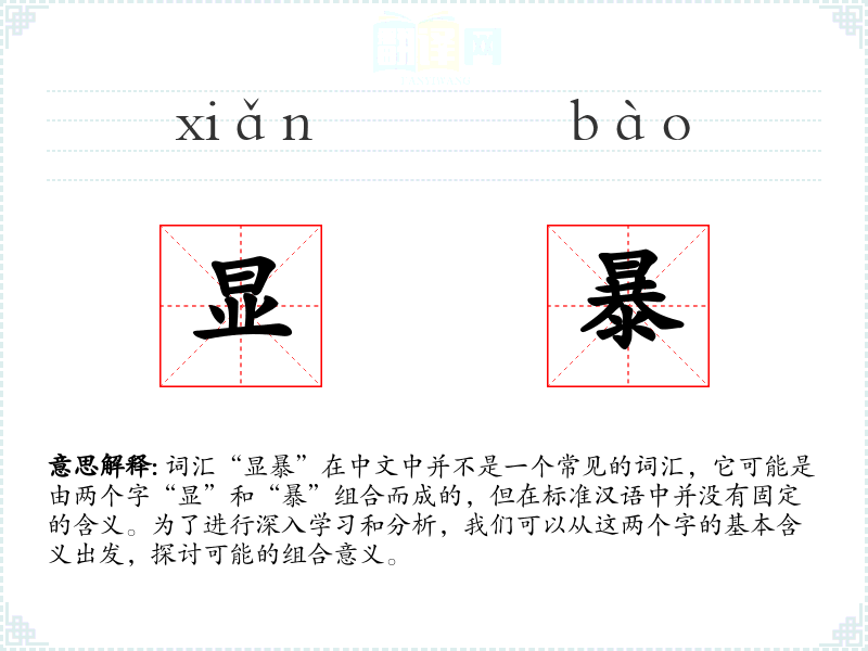词汇“显暴”在中文中并不是一个常见的词汇,它可能是由两个字“显”和“暴”组合而成的,但在标准汉语中并没有固定的含义。为了进行深入学*和分析,我们可以从这两个字的基本含义出发,探讨可能的组合意义。