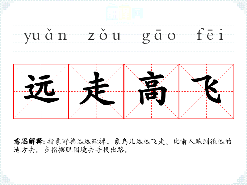 指象野兽远远跑掉,象鸟儿远远飞走。比喻人跑到很远的地方去。多指摆脱困境去寻找出路。