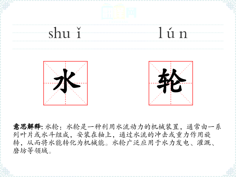 - 反义词:电动机(水轮是利用水能,而电动机是利用电能)