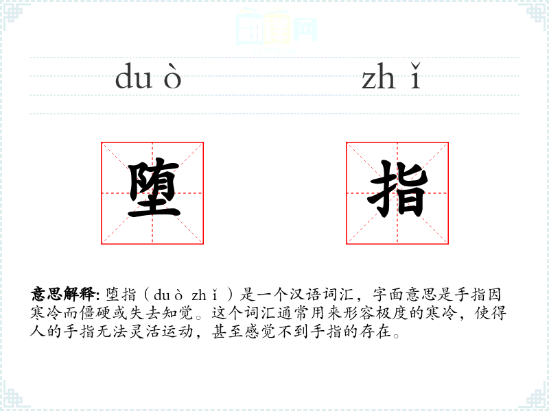 堕指(duò zhǐ)是一个汉语词汇,字面意思是手指因寒冷而僵硬或失去知觉。这个词汇通常用来形容极度的寒冷,使得人的手指无法灵活**,甚至感觉不到手指的存在。