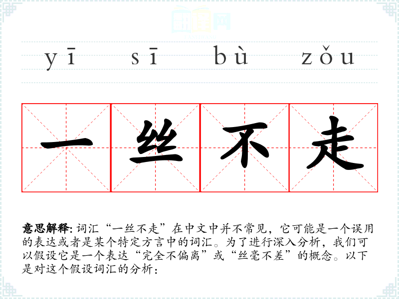 词汇“一丝不走”在中文中并不常见,它可能是一个误用的表达或者是某个特定方言中的词汇。为了进行深入分析,我们可以假设它是一个表达“完全不偏离”或“丝毫不差”的概念。以下是对这个假设词汇的分析: