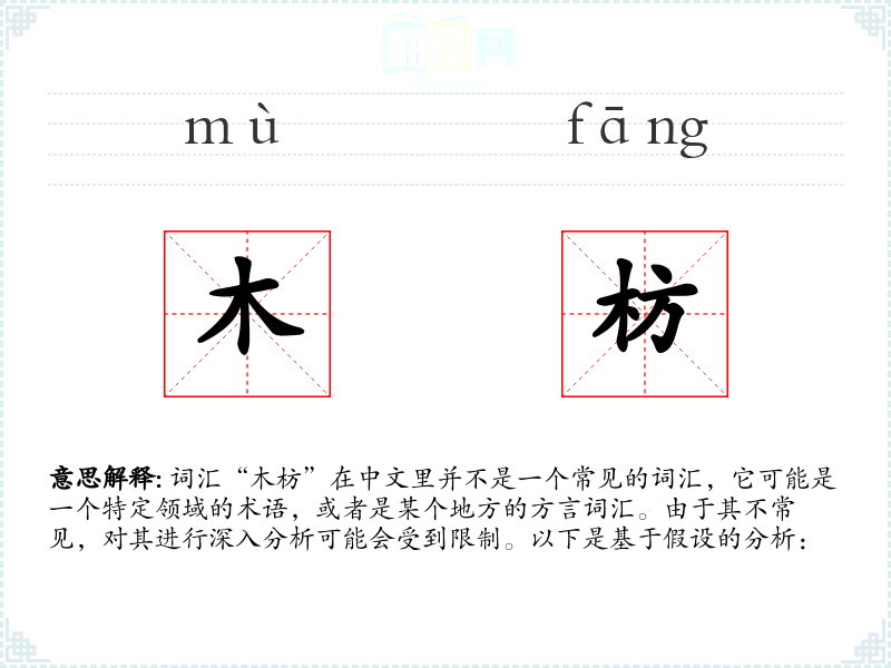 词汇“木枋”在中文里并不是一个常见的词汇,它可能是一个特定领域的术语,或者是某个地方的方言词汇。由于其不常见,对其进行深入分析可能会受到限制。以下是基于假设的分析: