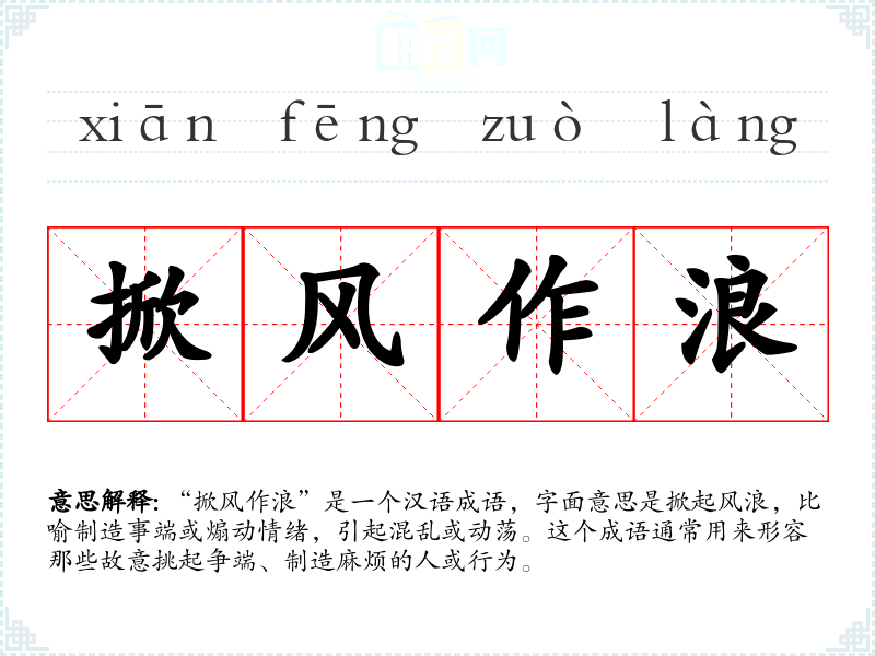 “掀风作浪”是一个汉语成语,字面意思是掀起风浪,比喻制造事端或煽动情绪,引起混乱或动荡。这个成语通常用来形容那些故意挑起争端、制造麻烦的人或行为。