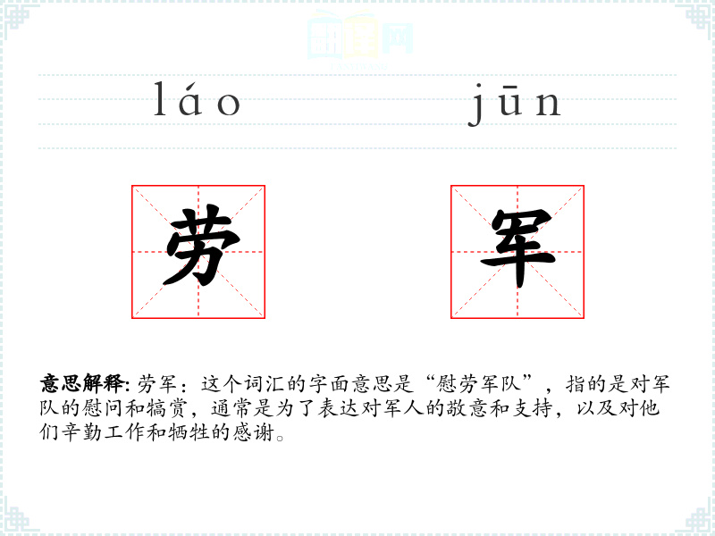 劳军:这个词汇的字面意思是“慰劳军队”,指的是对军队的慰问和犒赏,通常是为了表达对军人的敬意和支持,以及对他们辛勤工作和牺牲的感谢。