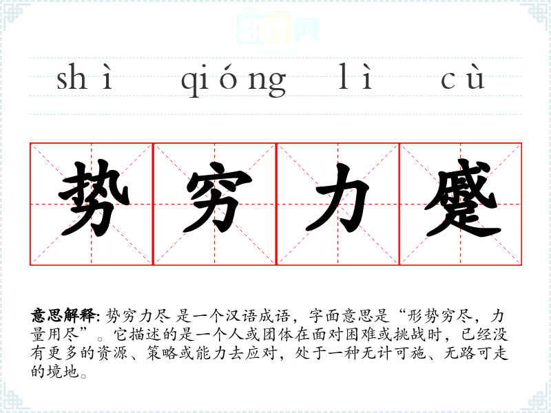 势穷力尽 是一个汉语成语,字面意思是“形势穷尽,力量用尽”。它描述的是一个人或团体在面对困难或挑战时,已经没有更多的资源、策略或能力去应对,处于一种无计可施、无路可走的境地。