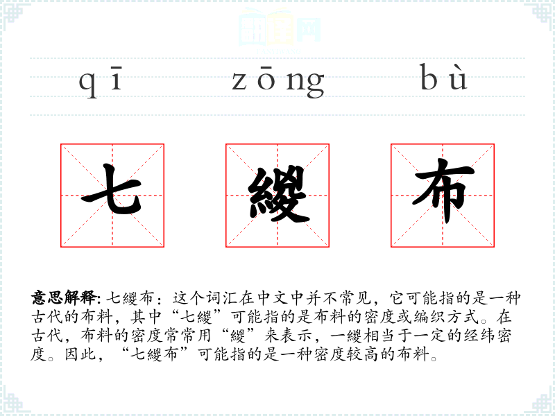 七緵布:这个词汇在中文中并不常见,它可能指的是一种古代的布料,其中“七緵”可能指的是布料的密度或编织方式。在古代,布料的密度常常用“緵”来表示,一緵相当于一定的经纬密度。因此,“七緵布”可能指的是一种密度较高的布料。