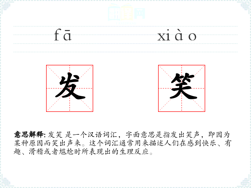 发笑 是一个汉语词汇,字面意思是指发出笑声,即因为某种原因而笑出声来。这个词汇通常用来描述人们在感到快乐、有趣、滑稽或者尴尬时所表现出的生理反应。