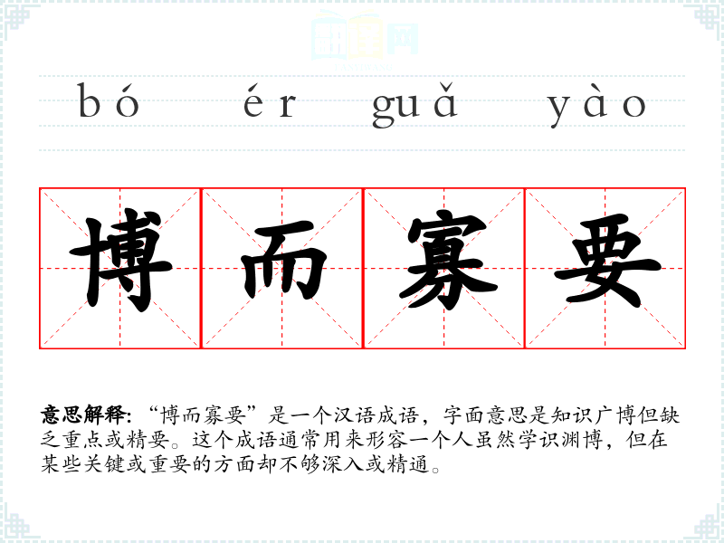 “博而寡要”是一个汉语成语,字面意思是知识广博但缺乏重点或精要。这个成语通常用来形容一个人虽然学识渊博,但在某些关键或重要的方面却不够深入或精通。