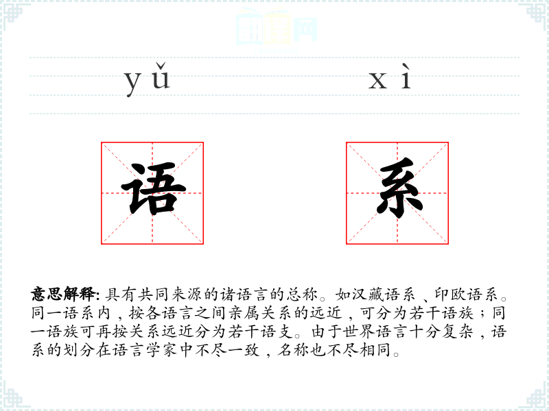 1.具有共同来源的诸语言的总称。如汉藏语系﹑印欧语系。同一语系内﹐按各语言之间亲属关系的远近﹐可分为若干语族﹔同一语族可再按关系远近分为若干语支。由于世界语言十分复杂﹐语系的划分在语言学家中不尽一致﹐名称也不尽相同。