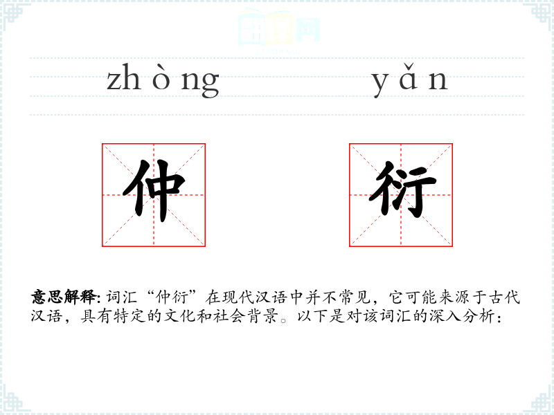 词汇“仲衍”在现代汉语中并不常见,它可能来源于古代汉语,具有特定的文化和社会背景。以下是对该词汇的深入分析: