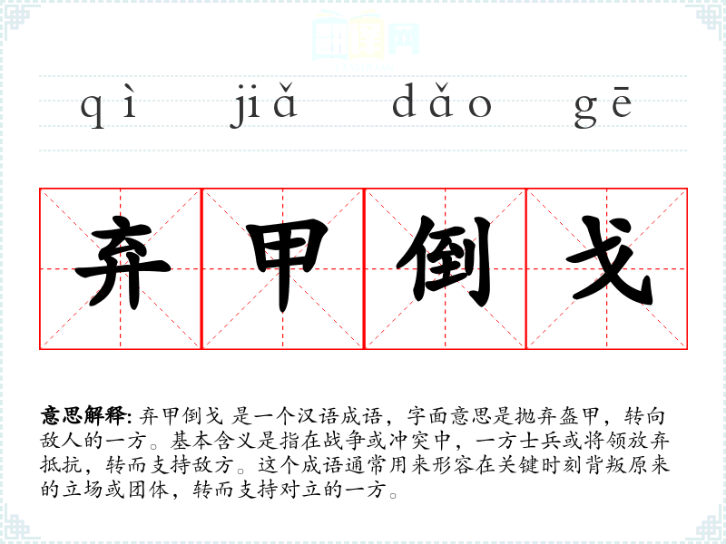 “弃甲倒戈”这个成语源自古代战争,甲指盔甲,戈是古代的一种兵器。随着时间的推移,这个成语的意义扩展到了更广泛的背叛行为,不仅限于军事领域。