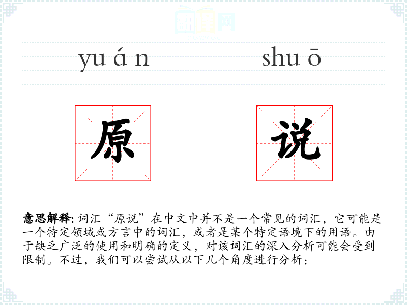 由于“原说”不是一个标准词汇,我们无法给出一个确切的字面意思和基本含义。它可能是指“原来的说法”或“最初的陈述”,但这只是基于字面组合的猜测。