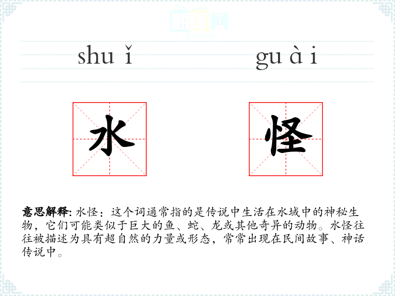 - 反义词:无,因为水怪是一个特定概念,没有直接的反义词。
