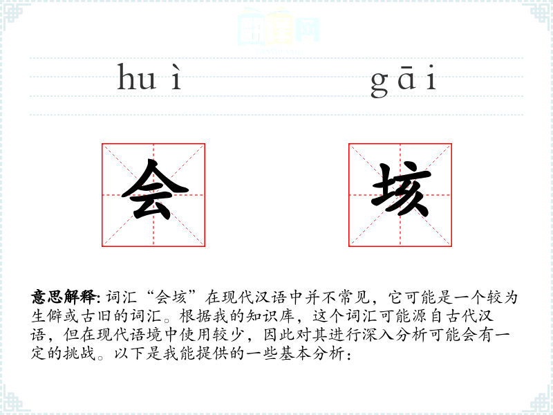 词汇“会垓”在现代汉语中并不常见,它可能是一个较为生僻或古旧的词汇。根据我的知识库,这个词汇可能源自古代汉语,但在现代语境中使用较少,因此对其进行深入分析可能会有一定的挑战。以下是我能提供的一些基本分析:
