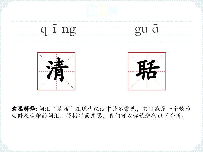 词汇“清聒”在现代汉语中并不常见,它可能是一个较为生僻或古雅的词汇。根据字面意思,我们可以尝试进行以下分析:
