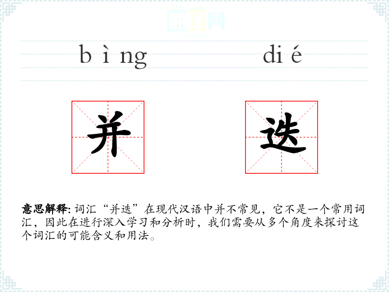 通过对“并迭”这个词汇的分析,我们可以看到它在现代汉语中并不常见,其确切含义和用法可能需要结合具体语境来确定。在学*语言时,了解和掌握常用词汇更为重要,而非常用词汇可能需要更多的语境支持才能准确理解和使用。