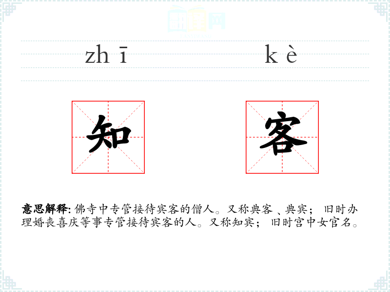 佛寺中专管接待宾客的僧人。又称典客﹑典宾; 旧时办理婚丧喜庆等事专管接待宾客的人。又称知宾; 旧时宫中女官名。