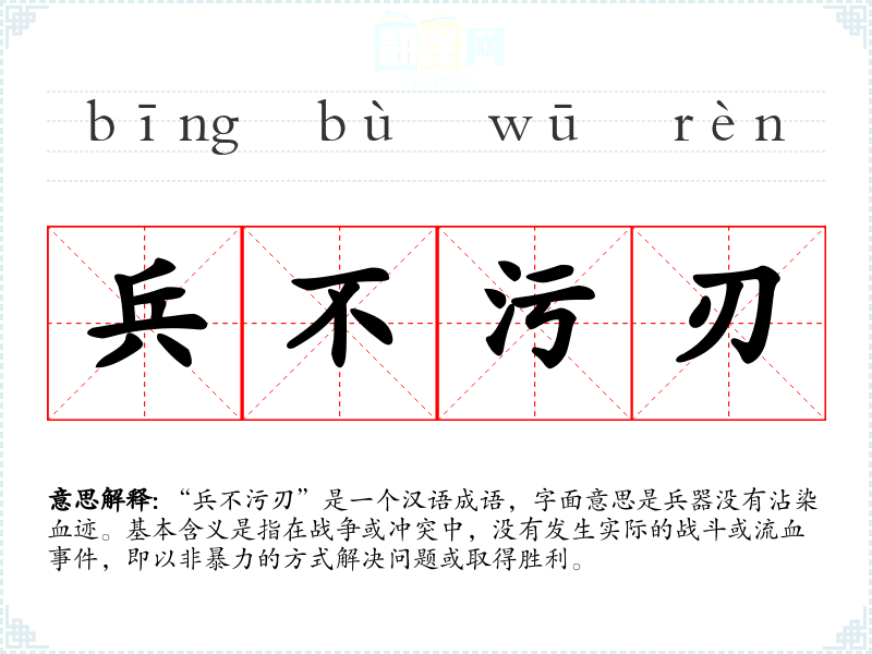 “兵不污刃”是一个汉语成语,字面意思是兵器没有沾染血迹。基本含义是指在战争或冲突中,没有发生实际的战斗或流血**,即以非暴力的方式解决问题或取得胜利。
