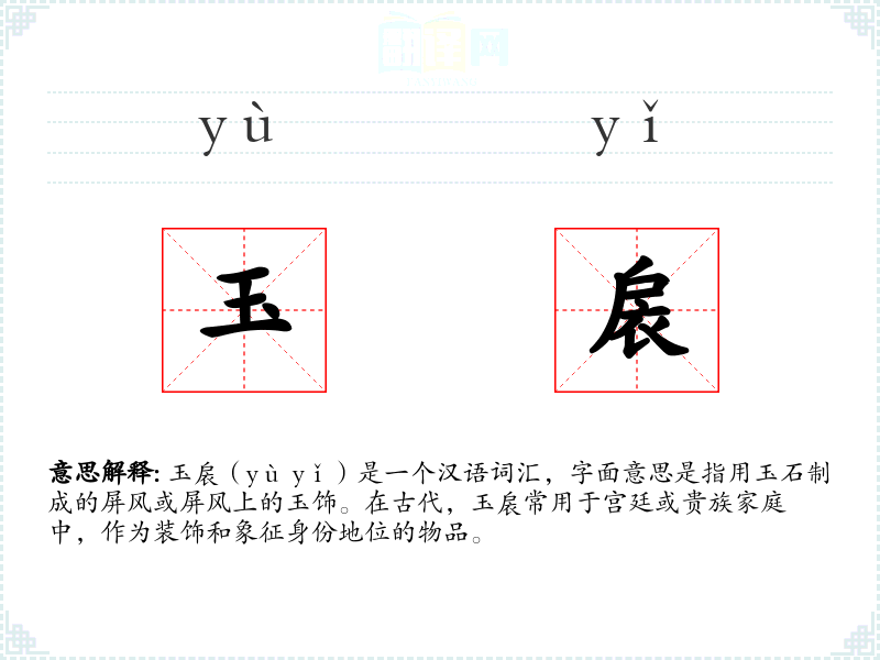 玉扆(yù yǐ)是一个汉语词汇,字面意思是指用玉石制成的屏风或屏风上的玉饰。在古代,玉扆常用于宫廷或贵族家庭中,作为装饰和象征身份地位的物品。