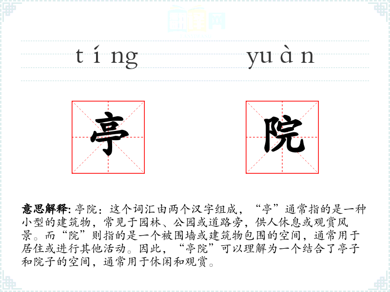亭院:这个词汇由两个汉字组成,“亭”通常指的是一种小型的建筑物,常见于园林、公园或道路旁,供人休息或观赏风景。而“院”则指的是一个被围墙或建筑物包围的空间,通常用于居住或进行其他活动。因此,“亭院”可以理解为一个结合了亭子和院子的空间,通常用于休闲和观赏。
