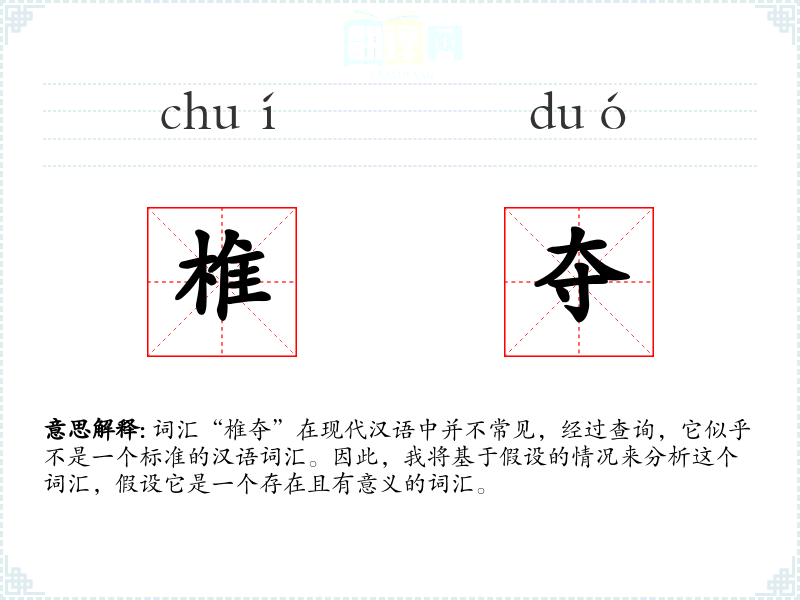 词汇“椎夺”在现代汉语中并不常见,经过查询,它似乎不是一个标准的汉语词汇。因此,我将基于假设的情况来分析这个词汇,假设它是一个存在且有意义的词汇。